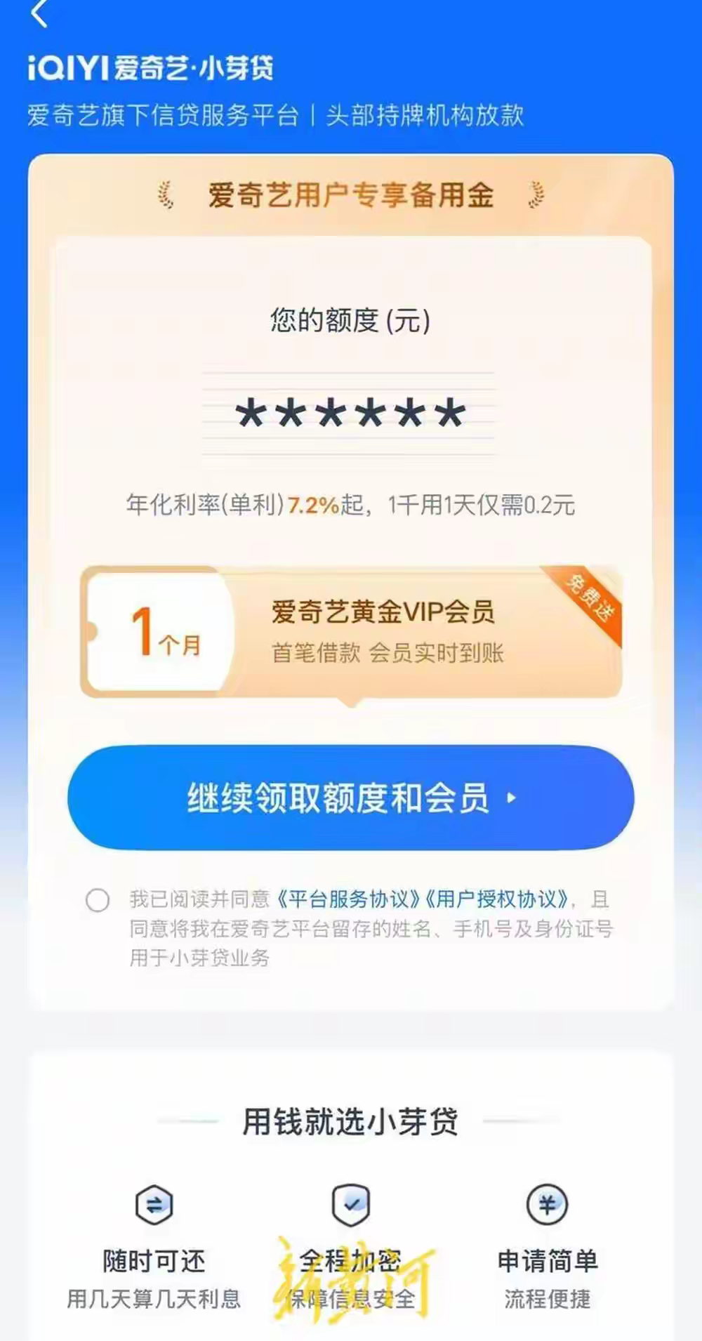 在爱奇艺的APP客户端,位于右下方的“我的”里可以看到有借钱的项目,在页面中写着“年利化率(单利)0.2%,一千用一天仅需0.2元;安全无忧、值得信赖”等标语。根据牛先生反映的情况,新黄河记者在10月29日联系了爱奇艺的官方工作人员。爱奇艺官方工作人员表示:“小芽贷全称是小芽贷信贷服务平台,是爱奇艺旗下开发、管理、运用的信贷服务平台,是与相关金融服务方提供接收服务的,如果账户中存在逾期未还款,金融机构会进行正常的催收,建议及时还款,避免因为逾期产生征信问题。爱奇艺作为官方平台,不会对借款方进行催收。”